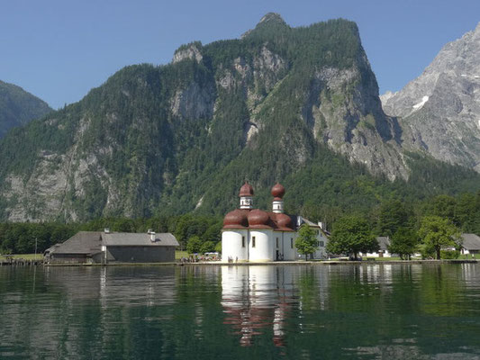Die Fahrt zur berühmten Wallfahrtskapelle St. Bartholomä war einfach atemberaubend. Man spürte förmlich, wie die Natur hier atmet. Das Wasser glitzerte, die steilen Felswände ragten in den Himmel und im Hintergrund zeigte sich die imposante Watzmann-Ostwand. Die Stille des Morgens wurde nur vom sanften Plätschern des Wassers unterbrochen.