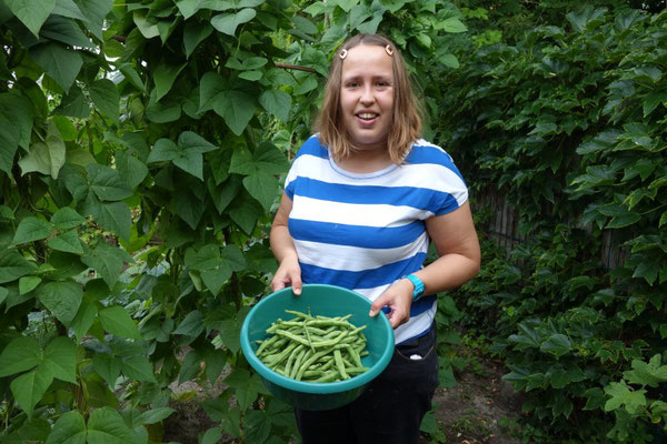 Heute hatte Christina das Vergnügen, sich um die Bohnenernte zu kümmern. Das bedeutete: pflücken, zerkleinern und für das Einfrieren vorbereiten. Jetzt können wir uns auf ein leckeres Essen freuen! Ich persönlich finde gebratene Bohnen mit Speck besonders köstlich – dazu noch ein paar Salzkartoffeln und Frikadellen. Einfach eine Mahlzeit, die glücklich macht!