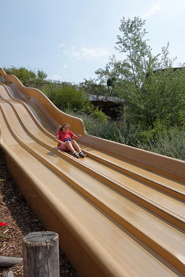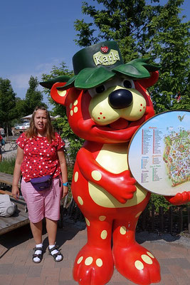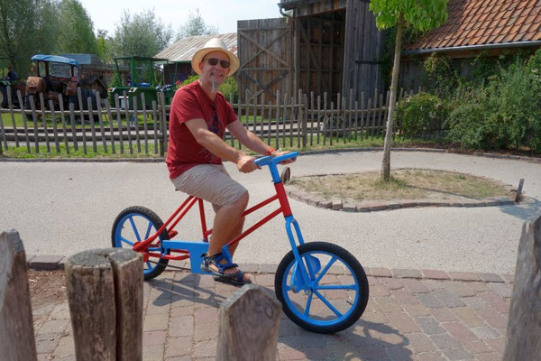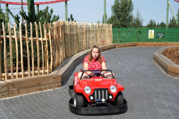 Ein absolutes Highlight war die Fahrt auf Deutschlands erster Holzloren-Achterbahn. Das war ein spektakuläres Erlebnis, und nach etwas Überzeugungsarbeit hat sich auch Christina getraut! Auch wir "großen Kinder" kamen nicht zu kurz: Ich habe mich am wackeligen "Drahteselhopping" versucht, was echtes Geschick erforderte. Christina hat die Fahrt auf einem anderen Fahrgeschäft als angenehmer empfunden, was gut nachvollziehbar ist.