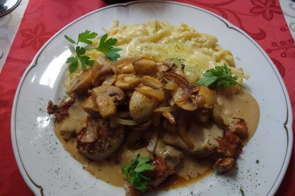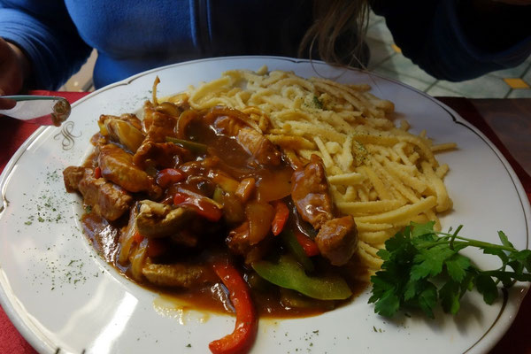 Zum Mittagessen kehrten wir im Restaurant "Zur alten Post" in der Rheinstraße ein. Andreas genoss ein gegrilltes Schweinefilet mit Pilzen, Rahmsoße und Käsespätzle, während Christina ein ausgezeichnetes ungarisches Gulasch mit Spätzle bestellte. Der freundliche Service rundete das Erlebnis ab.