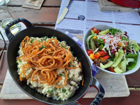 Nach dem ausgiebigen Spaziergang meldete sich der Hunger. Wir kehrten in das Restaurant der Burg ein, um uns mit Käsespätzle und Salat zu stärken – ein echtes kulinarisches Erlebnis, das wir nur wärmstens empfehlen können. Und das Bier? Ein wahrer Genuss! Es gibt Momente, in denen man einfach nur dankbar sein kann, dass es solche Orte gibt, die das Herz höher schlagen lassen.
