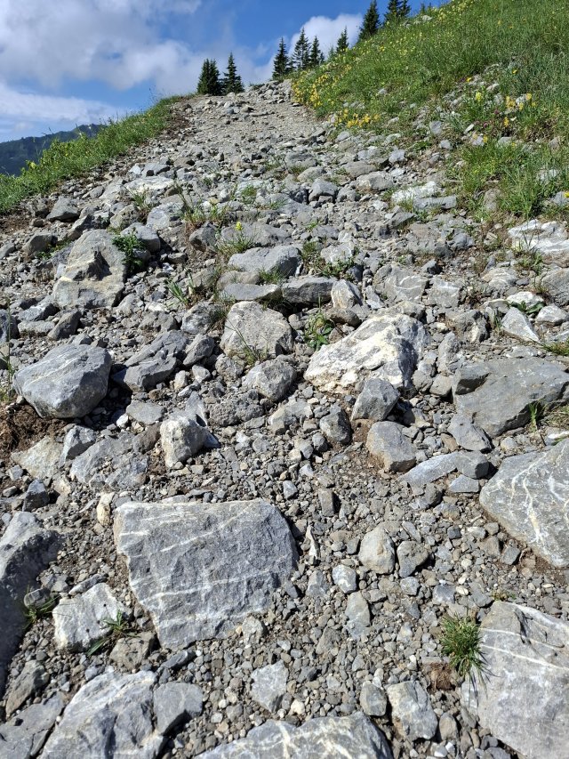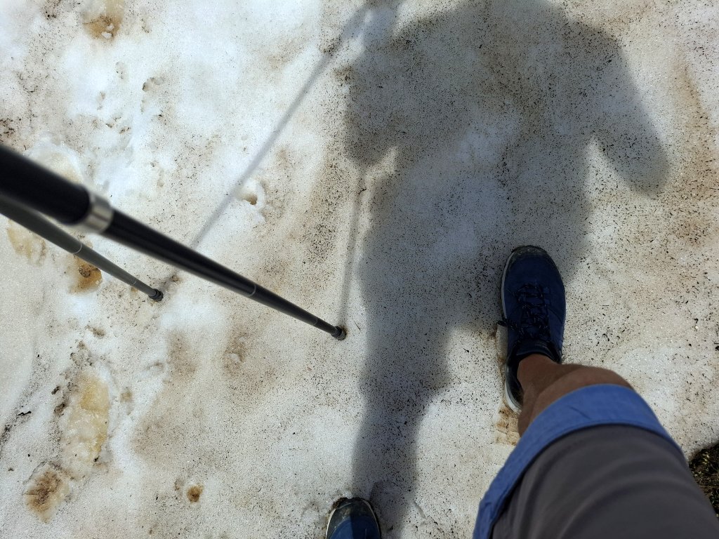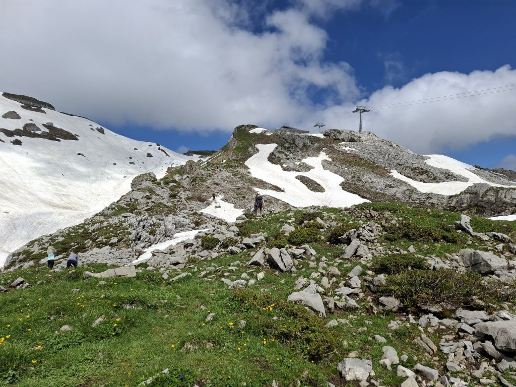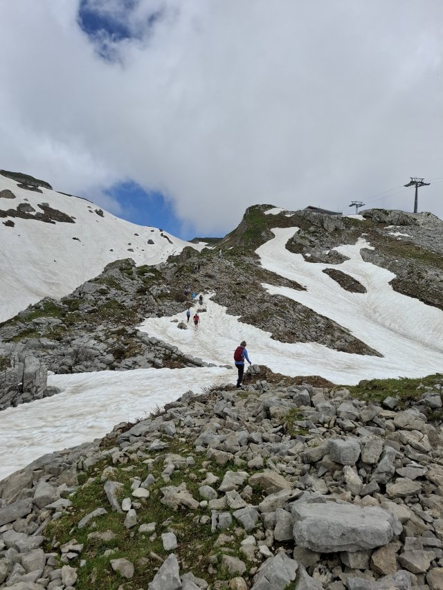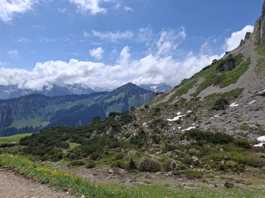 Der geplante Aufstieg zum Hahnenköpfle fand ein unerwartetes Ende. Drei hartnäckige Schneefelder versperrten den Weg. Ich musste schweren Herzens einsehen, dass Vernunft in den Bergen Vorrang hat.