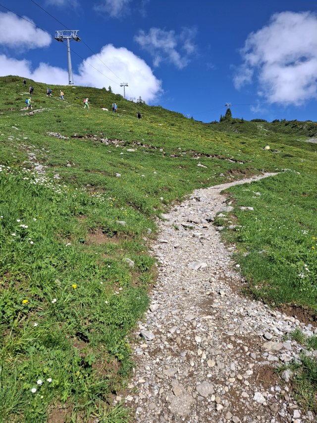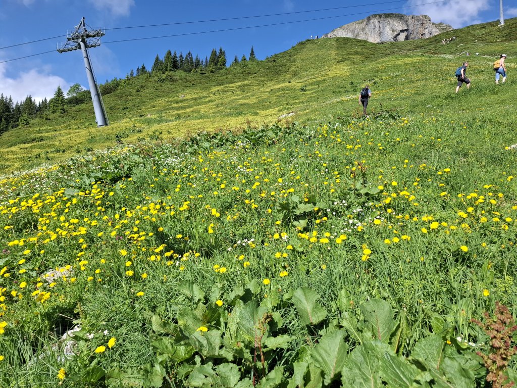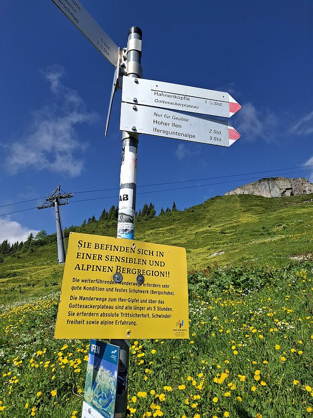 Von der Mittelstation aus tauchte ich in eine Welt voller Kontraste ein. Zuerst wanderte ich über grüne Wiesen, folgte der Route 3 in Richtung Hoher Ifen. Bald wich die sanfte Landschaft einer rauen, kargen Karstlandschaft. Die bizarr geformten Felsen erzählen ihre eigenen Geschichten, während in den Spalten farbenfrohe Alpenblumen leuchten.