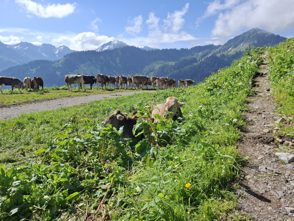Mein Wanderabenteuer begann am Morgen am Busbahnhof Oberstdorf. Mit den Linien 1 und 5 erreichte ich gegen 9:30 Uhr die Talstation der Ifenbahn. Die bequeme Auffahrt zur Mittelstation war ein perfekter Start. Dort empfing mich das friedliche Läuten der Almkühe und der Duft von frischen Bergwiesen.