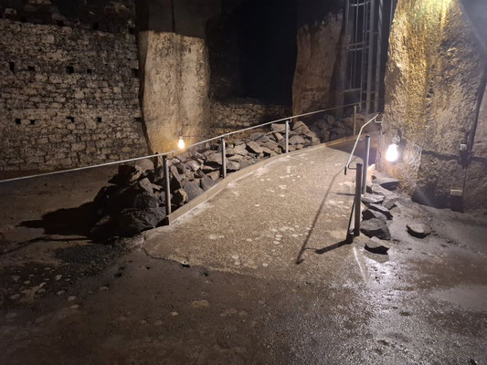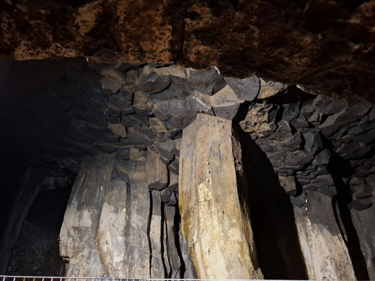 Pünktlich um 12:00 Uhr war es dann so weit: Wir betraten den weltweit einzigartigen Felsenkeller. Schon die 150 Stufen hinab in die Tiefe sind ein Erlebnis für sich – direkt hinein in einen erstarrten Lavastrom! Wer es bequemer mag, kann aber auch den Aufzug nutzen.