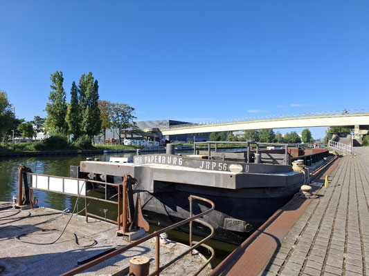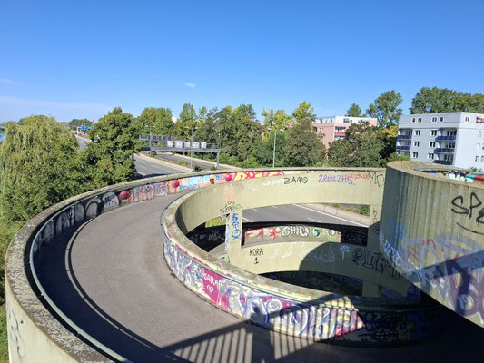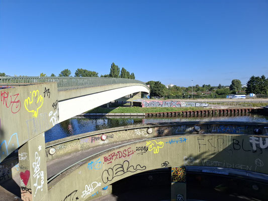 Mein Spaziergang führte mich am idyllischen Westhafenkanal entlang. Dieser junge Kanal wurde bereits 1938 begonnen, aber erst nach dem Zweiten Weltkrieg, zwischen 1954 und 1956, fertiggestellt. Er ersetzte einen älteren, kurvenreichen Kanal und schuf eine direkte Verbindung zwischen dem Westhafen und der Spree. Mein Weg führte mich weiter über den Goerdelersteg. Diese geschwungene Fußgängerbrücke wurde 1976 nach Carl Friedrich Goerdeler benannt, einem Widerstandskämpfer des 20. Juli 1944. Ursprünglich stand hier ein einfacher Holzsteg; die heutige Spannbetonbrücke wurde 1995 an dessen Stelle errichtet.